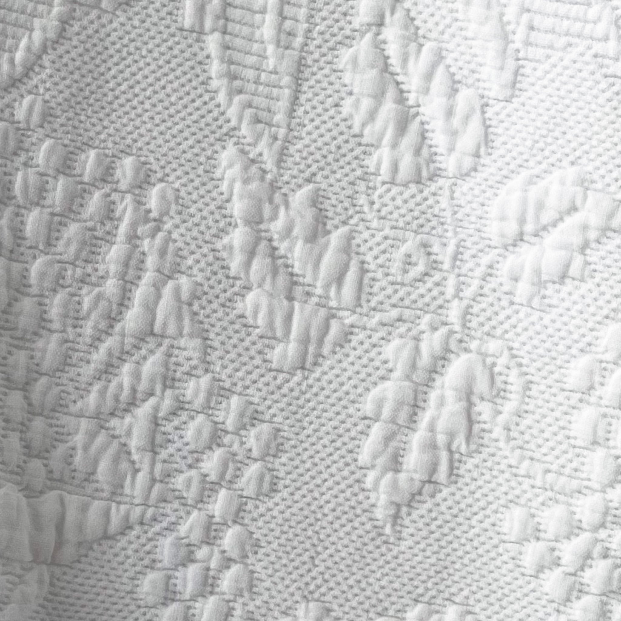 ピケ特有の凹凸のある織り模様はクラシカルで、キルトのような立体感。繊細な花や蔓、葡萄のモチーフが浮かび上がり、光の加減で表情を変える美しいテクスチャーが魅力です。