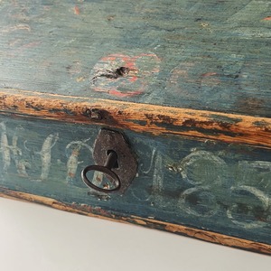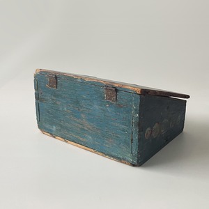 大変古い時代の木箱です。木肌の色味の変化やペイントの擦れに加え、蓋の右奥と底板の右奥に木の欠けが見られます。