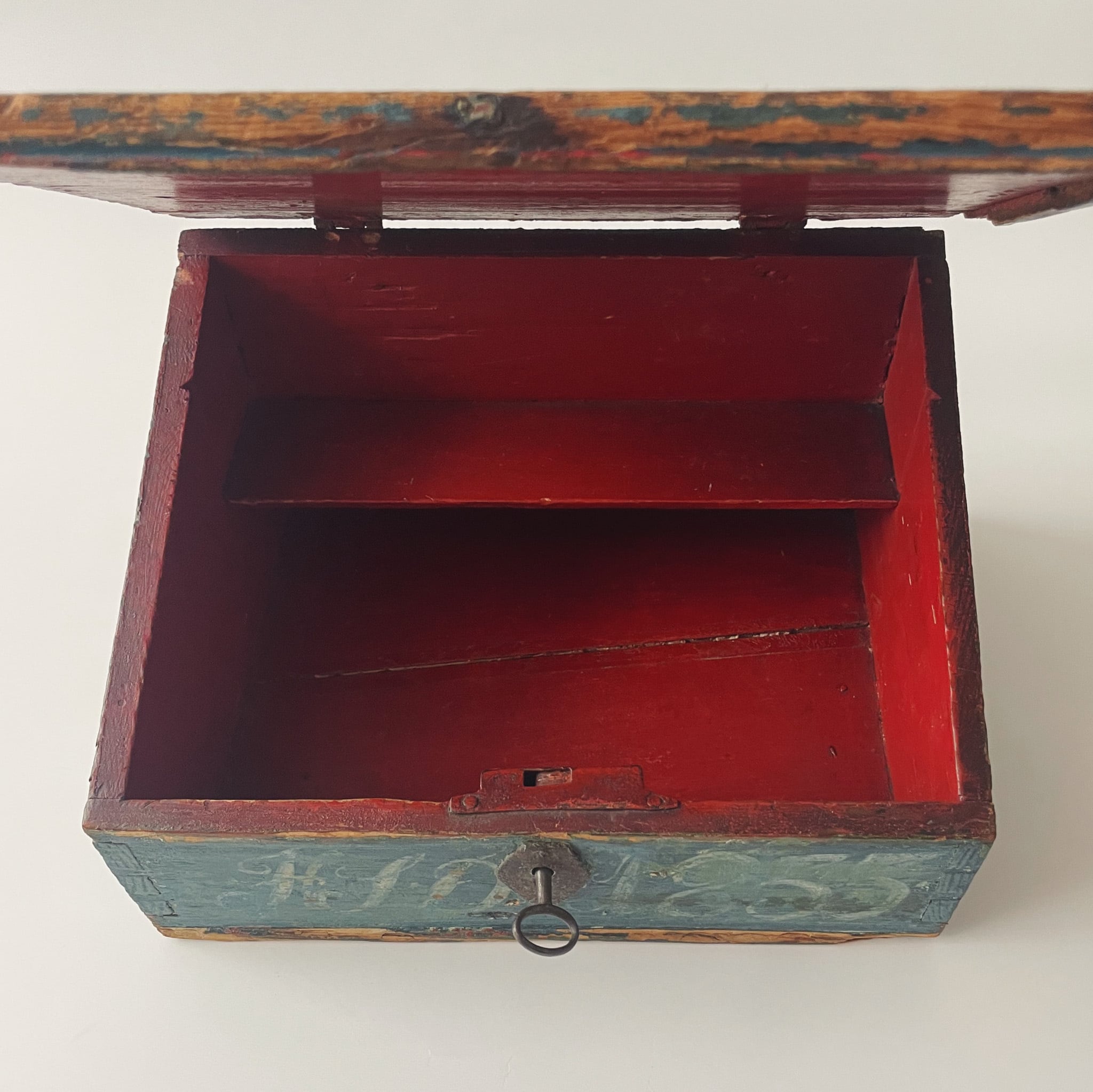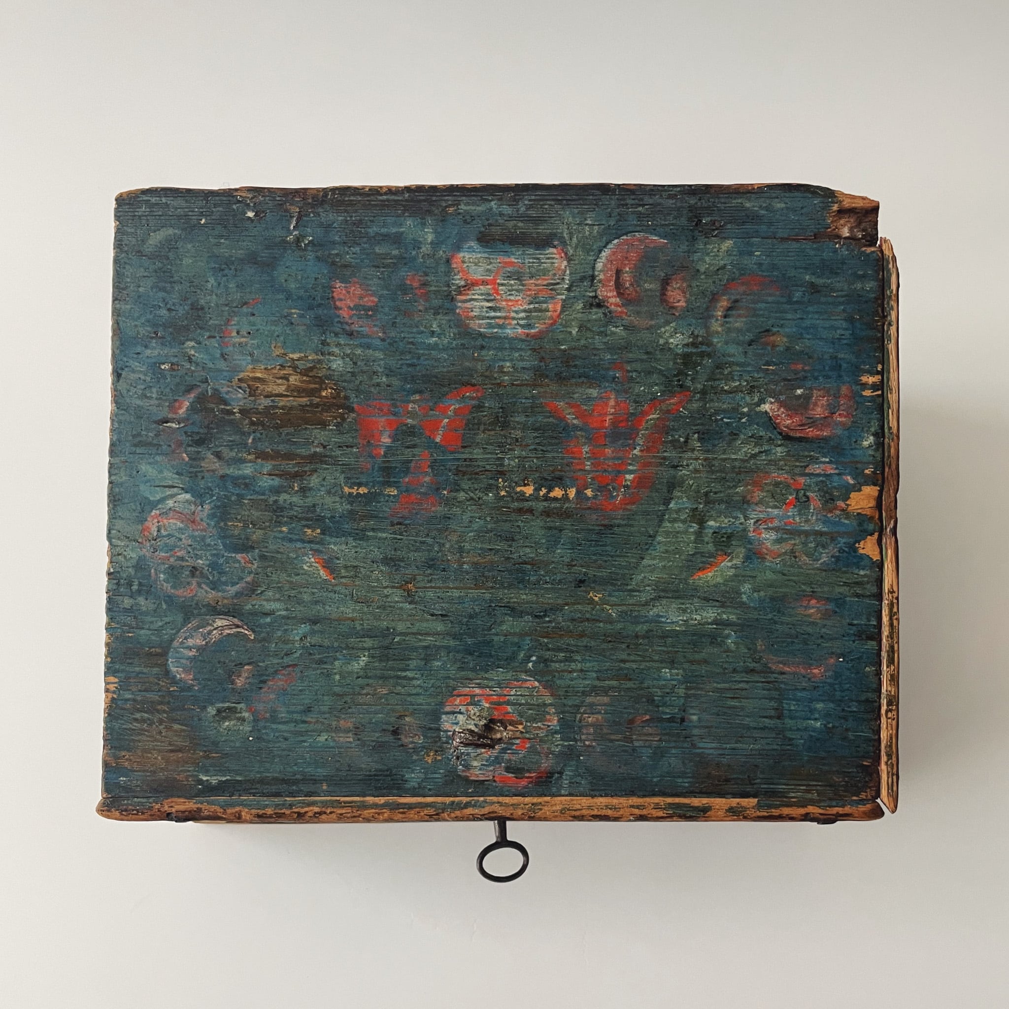 大変古い時代の木箱です。木肌の色味の変化やペイントの擦れに加え、蓋の右奥と底板の右奥に木の欠けが見られます。どれも経年ならではの味わいで、雰囲気を損なうものではありません。底板は安定しており、軽いものを収納することができます。