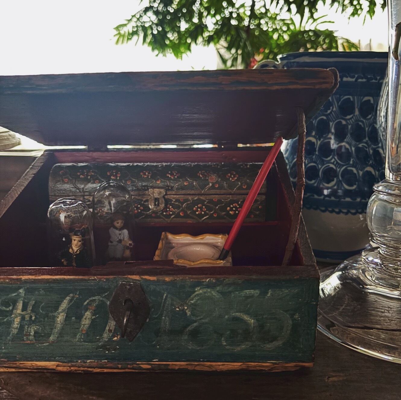 優しい青緑にのどかな花々が描かれ、蓋を開けると鮮やかな朱色。