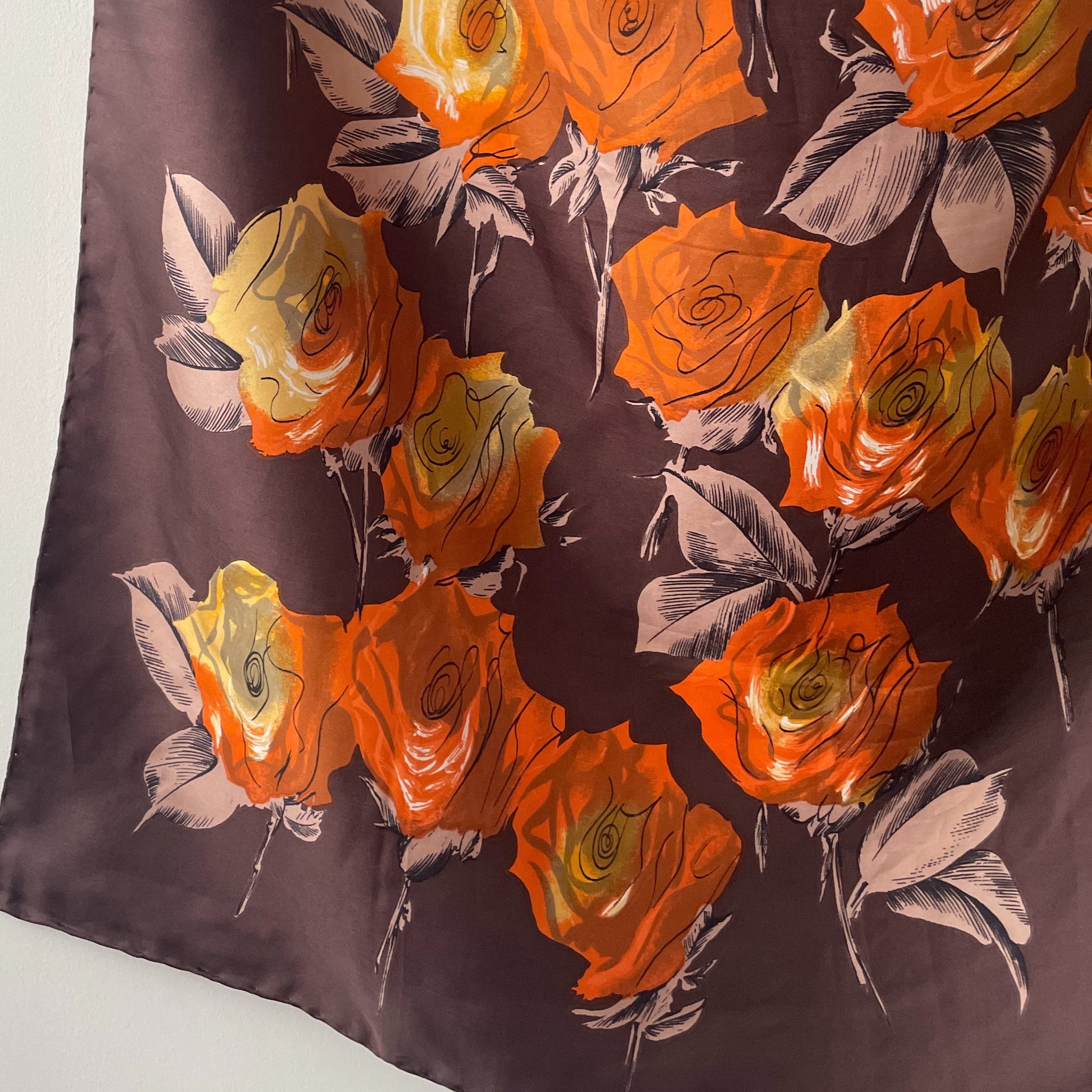 ショコラブラウンに、オレンジ色のローズが描かれたシルクスカーフ