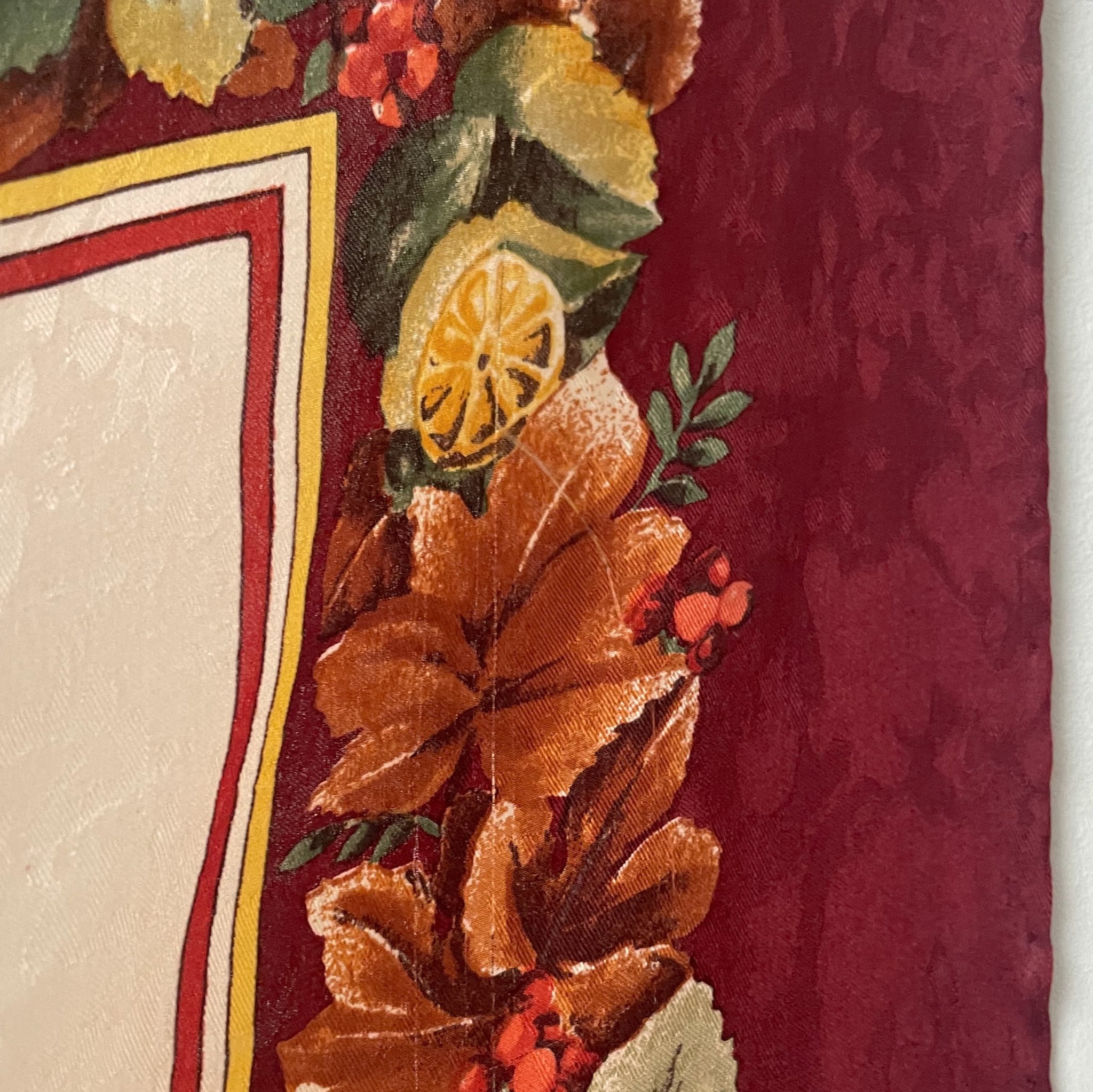 大人びたボルドーの縁どりに、どんぐりや果実、松ぼっくり、リスなど秋の実りが描かれています。光沢ある織り模様が重なり、品の良さが引き立ちます。