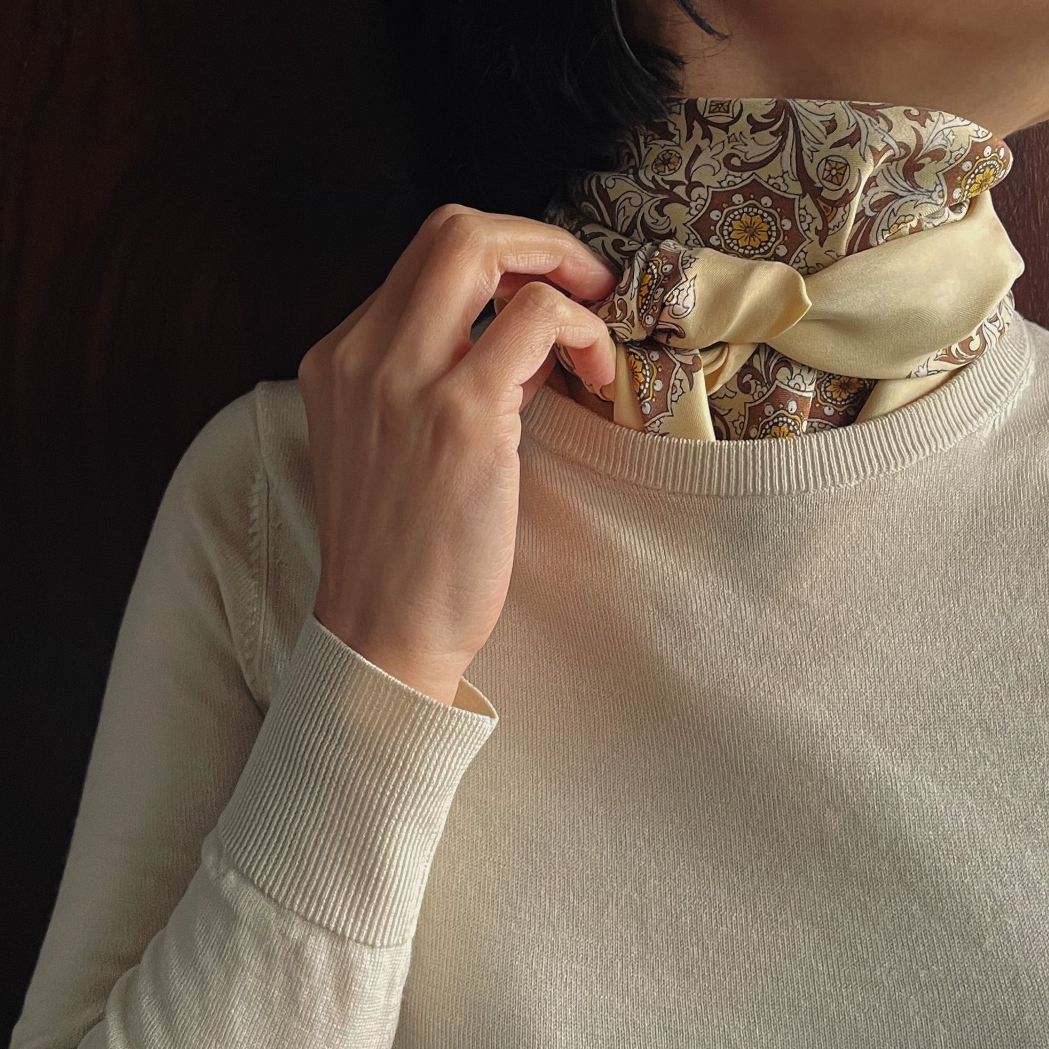 落ち着いたクリームイエローに、太陽や花を思わせる小さなモチーフと、縁を彩る曲線的な唐草模様。どこかオリエンタルな趣が漂う、クラシカルなシルクスカーフ。