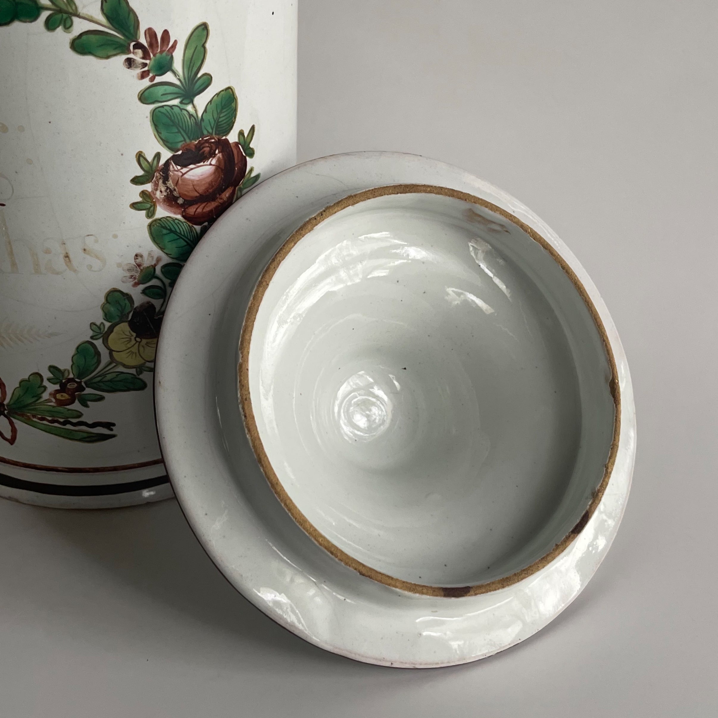 円筒型の本体にどんぐり型の摘み。盾型のフレームに描かれた花環の装飾に、ラテン語で記された薬名のカリグラフィー。