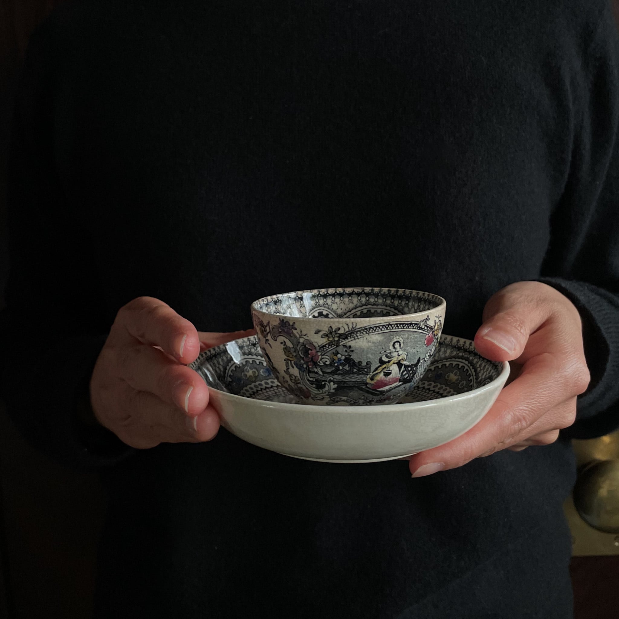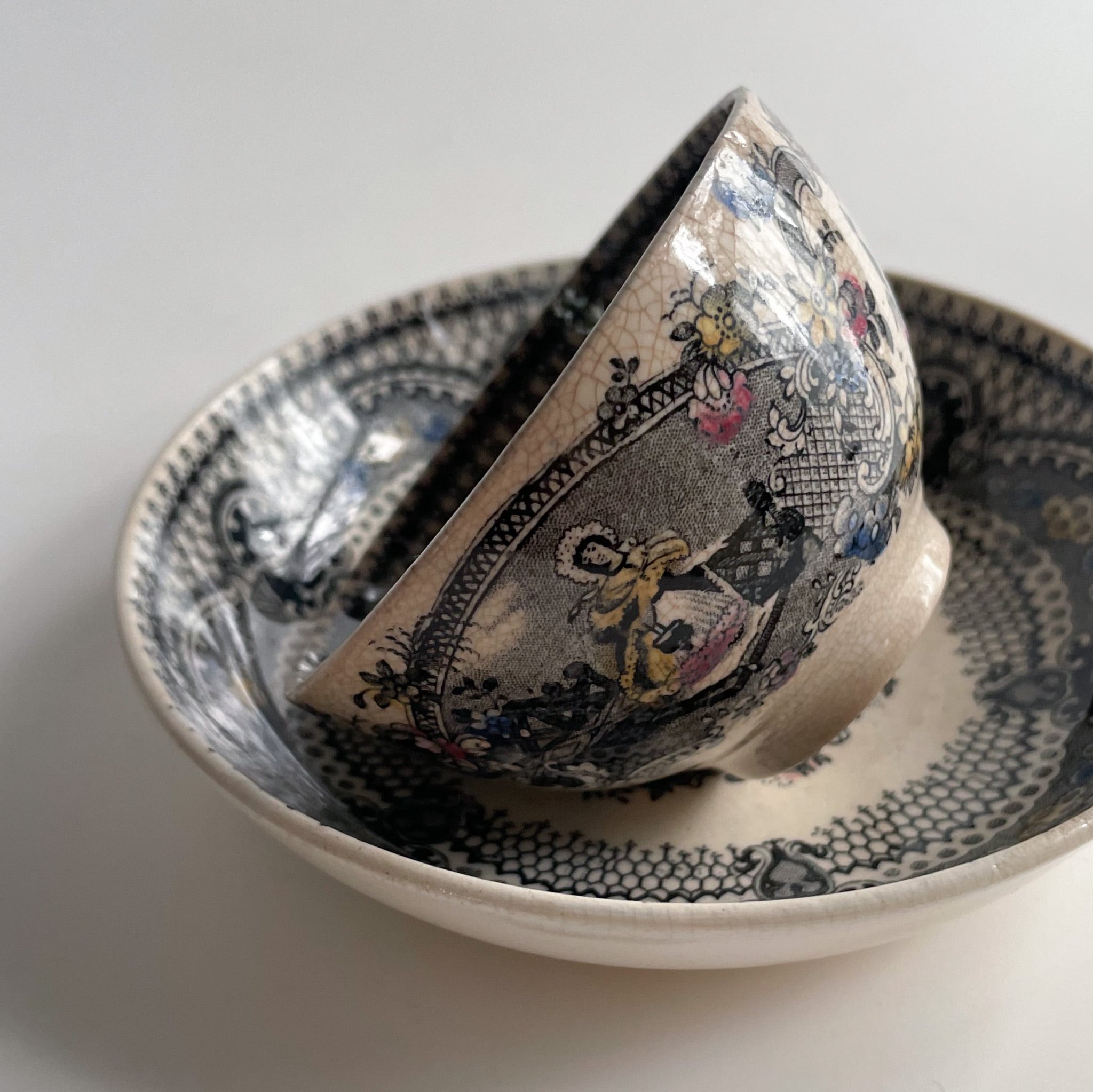 “VICTORIA” アンティーク ティーボウル&ソーサー|黒転写・手彩色 1822年〜1855年