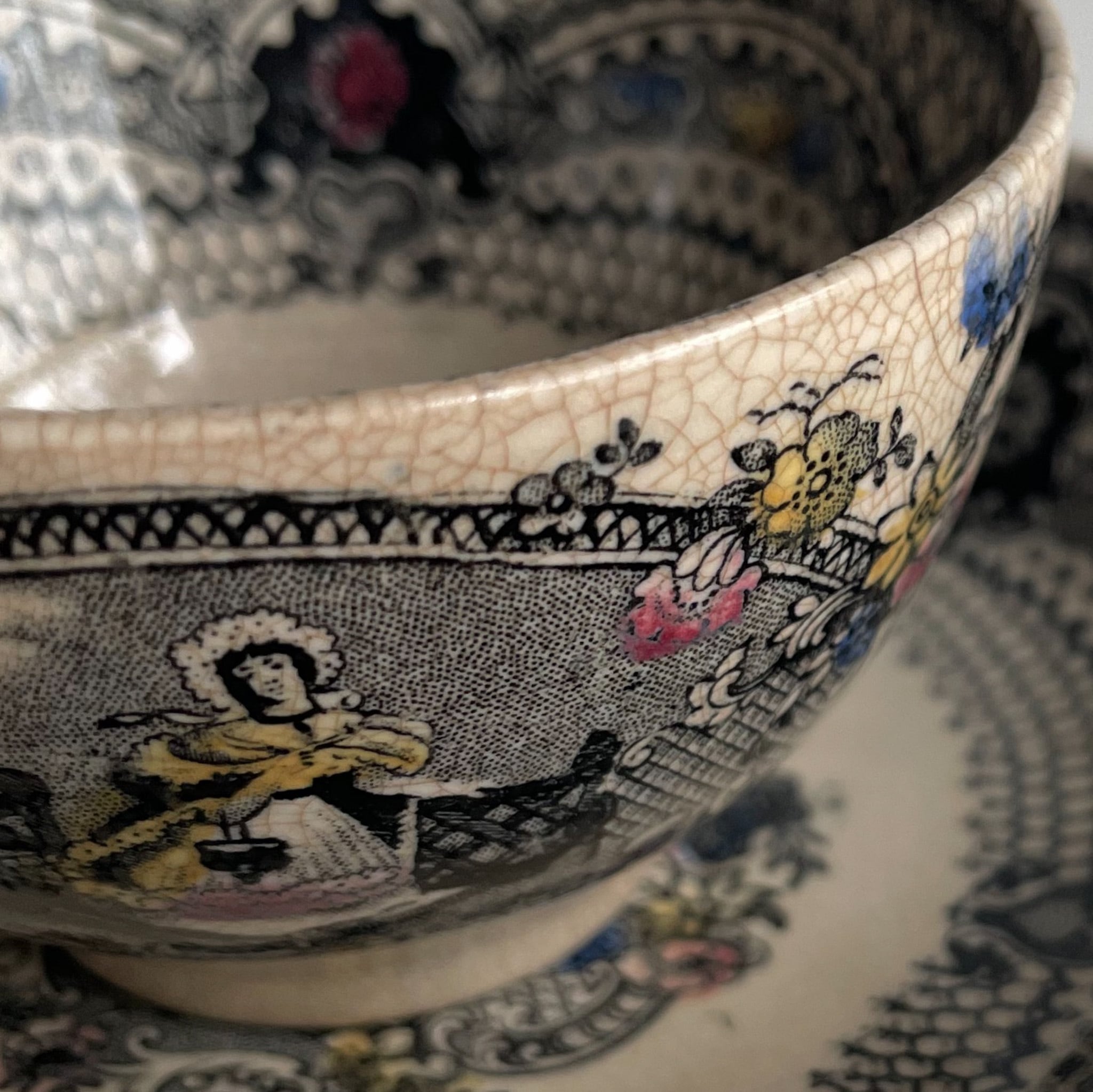 シックな黒転写 (transferware) に手彩色が重ねられ、ヴィクトリア女王を思わせる女性像と花々が繊細に描かれています。