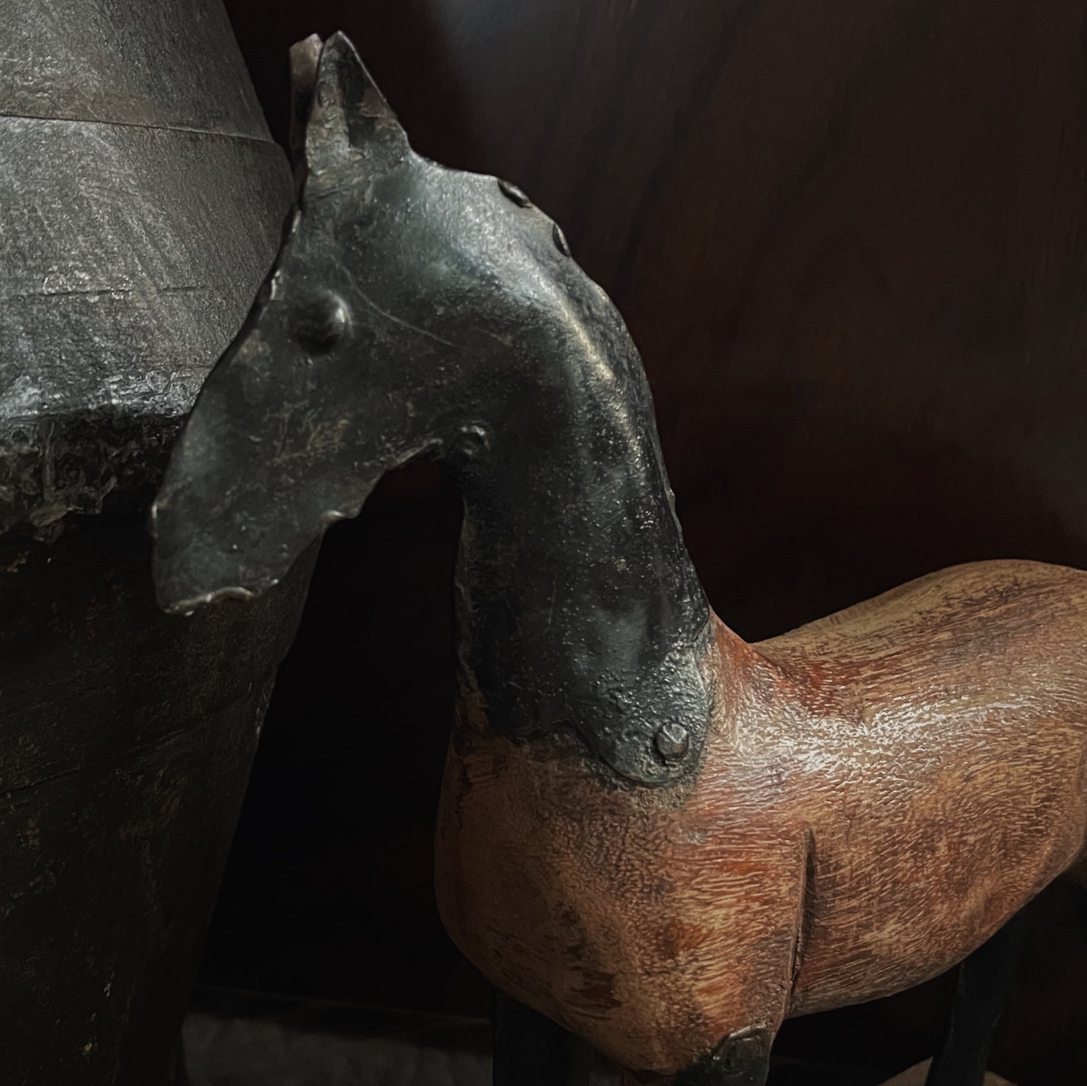 黒く落ち着いた表情の鉄の脚と頭部、やわらかな木の胴体。