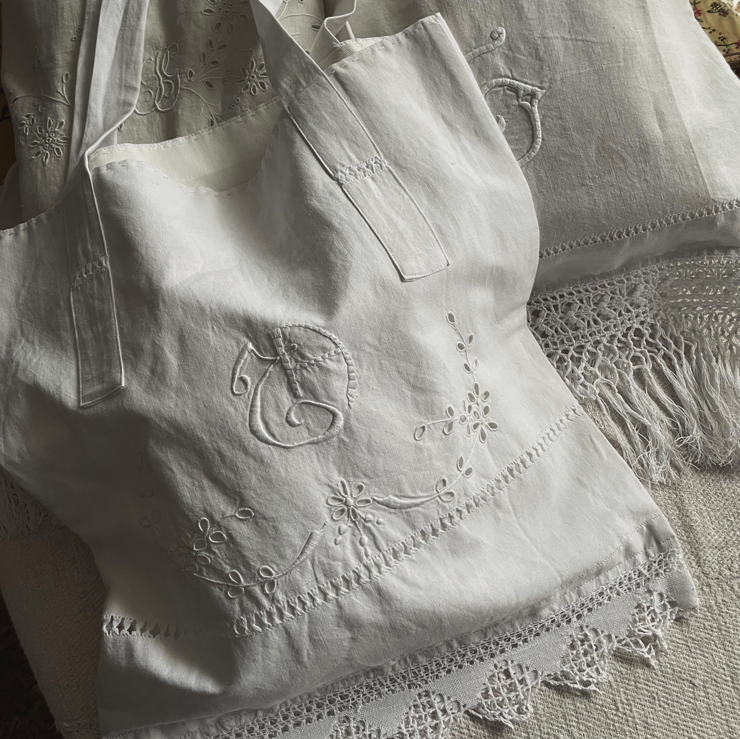 アンティークの白いリネン生地を用いた品物です。
