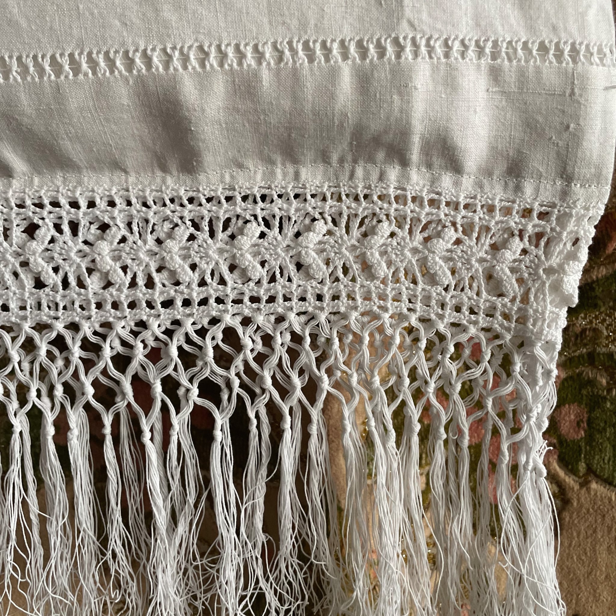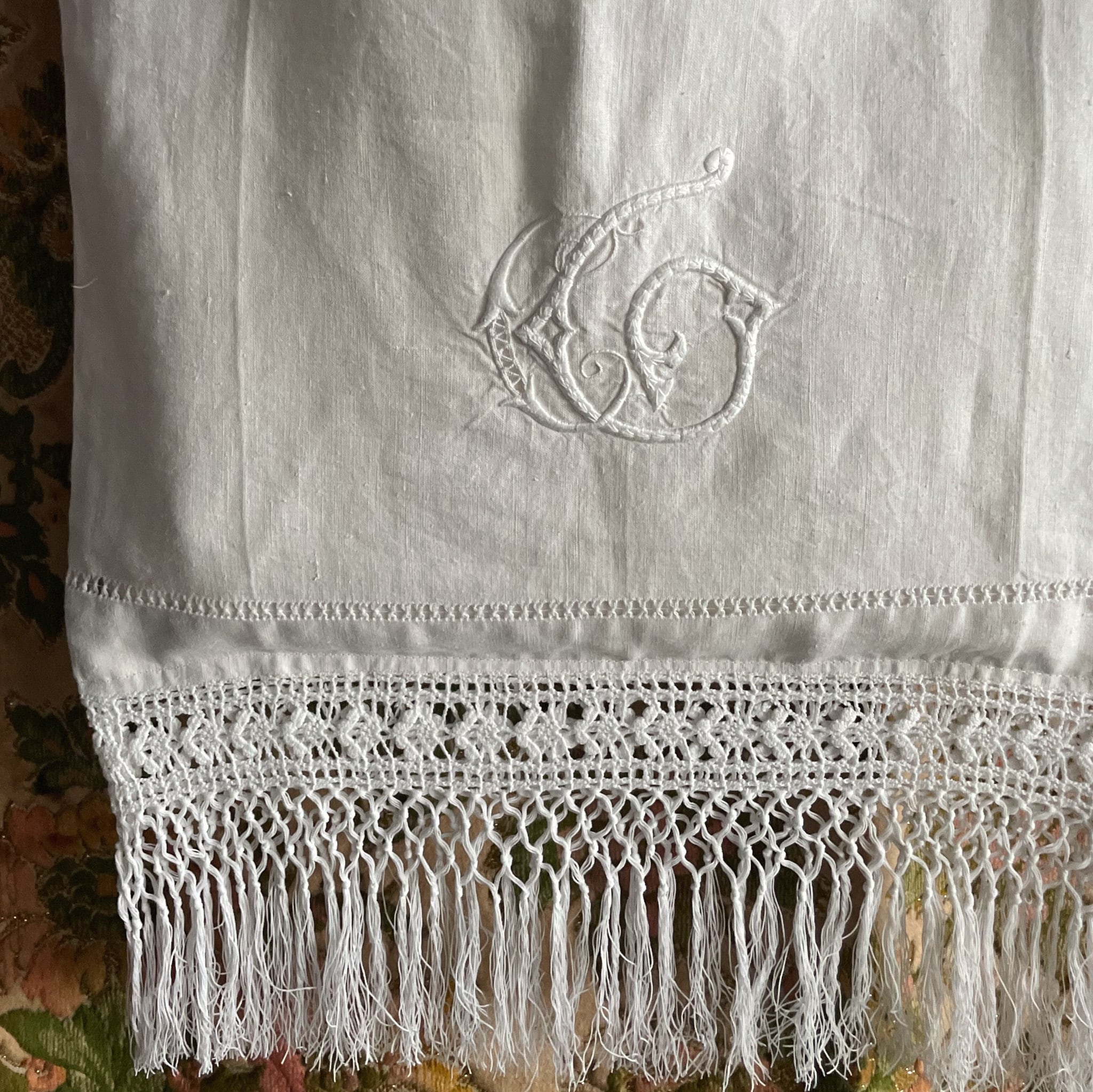 時を経た柔らかなリネンに施された、植物文様のふっくらとした刺繍と裾のフリンジ。