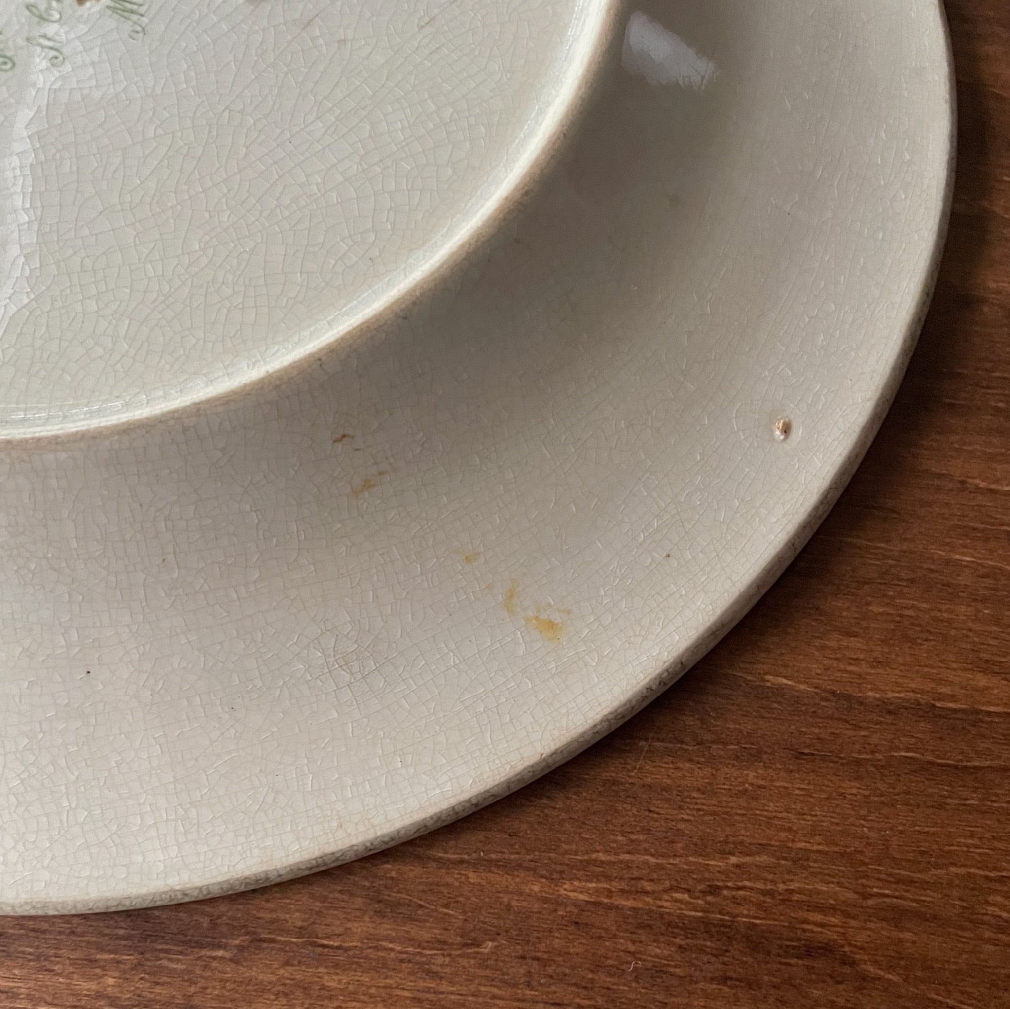 裏面縁付近に、黄色味を帯びた跡(シミ)がございます。表面的な汚れではなく、陶土に馴染んだアンティーク特有の風合いです。