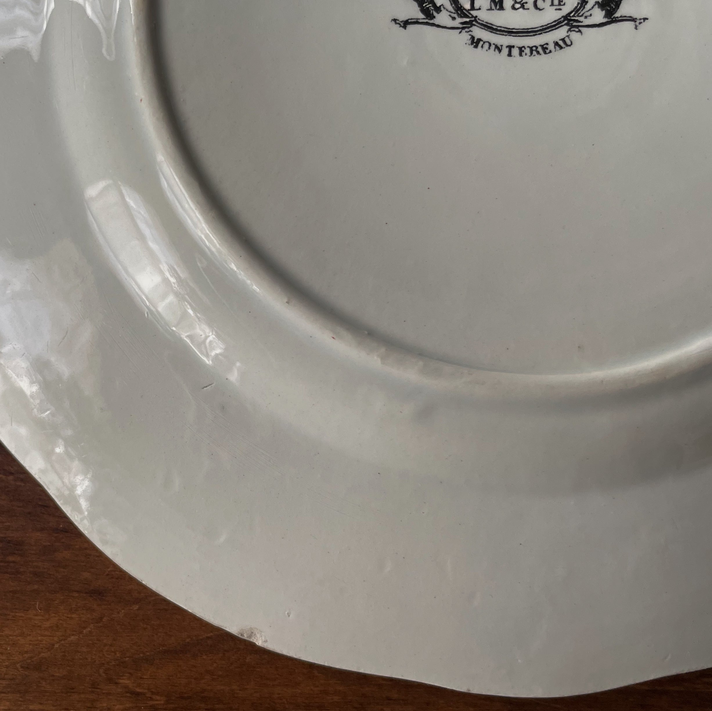 ラインは見当たりません。見込みに多少の釉薬の剥がれ、裏面リムにごく小さな欠けが見られますが、古物の雰囲気をお楽しみいただける範囲のものです。欠けは、表面からは見えません。