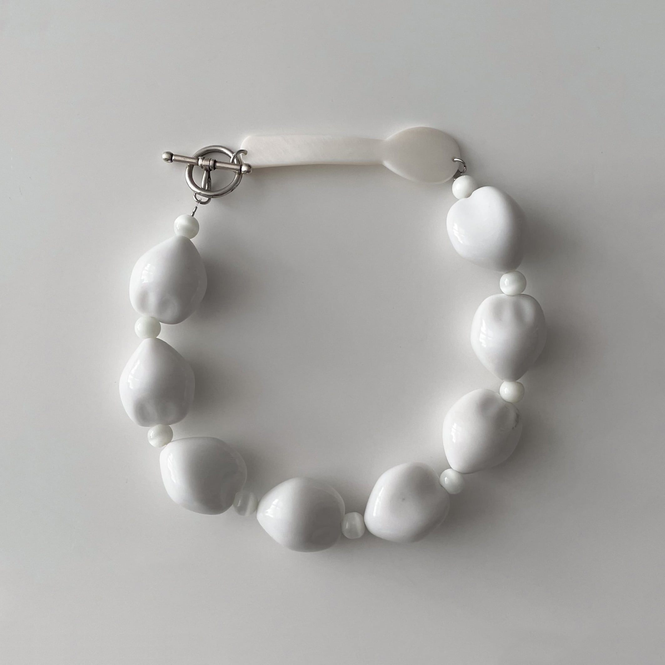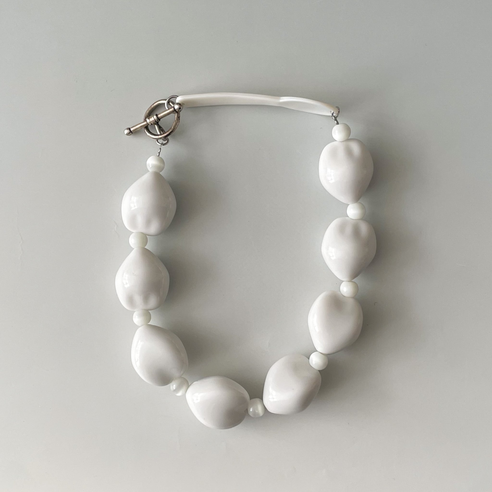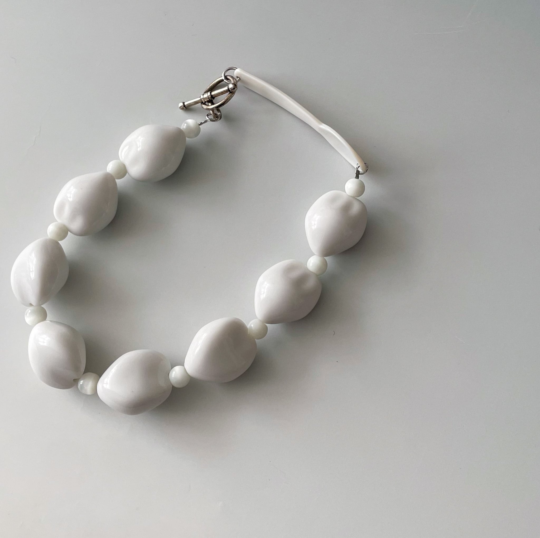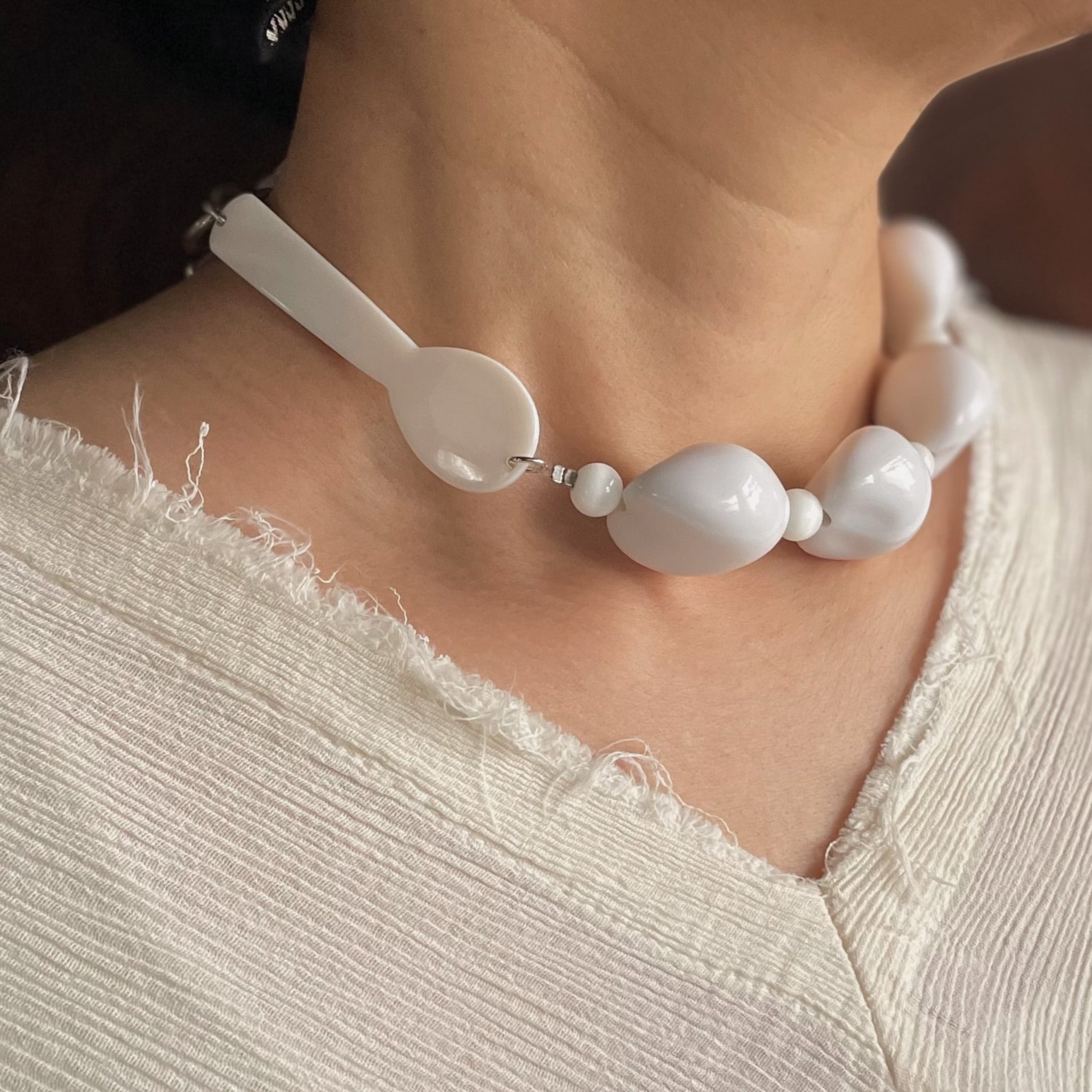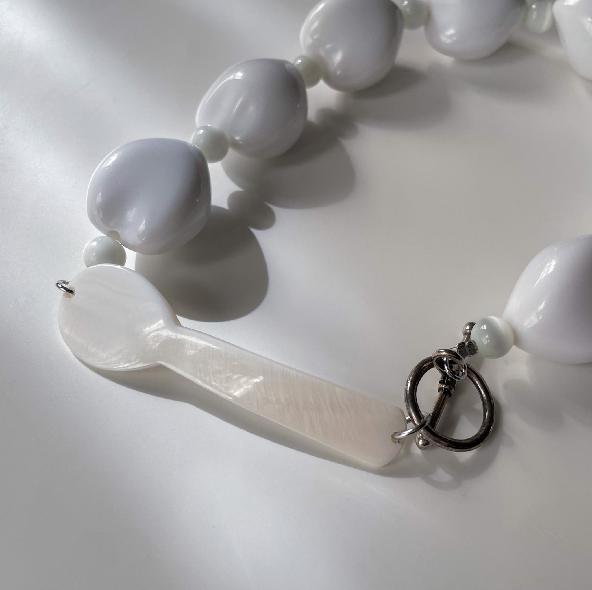 マザーオブパールのキャビアスプーンと、ホワイトアセテートビーズを組み合わせたネックレス。