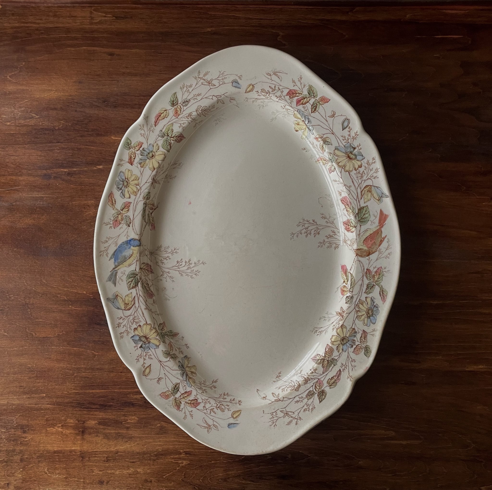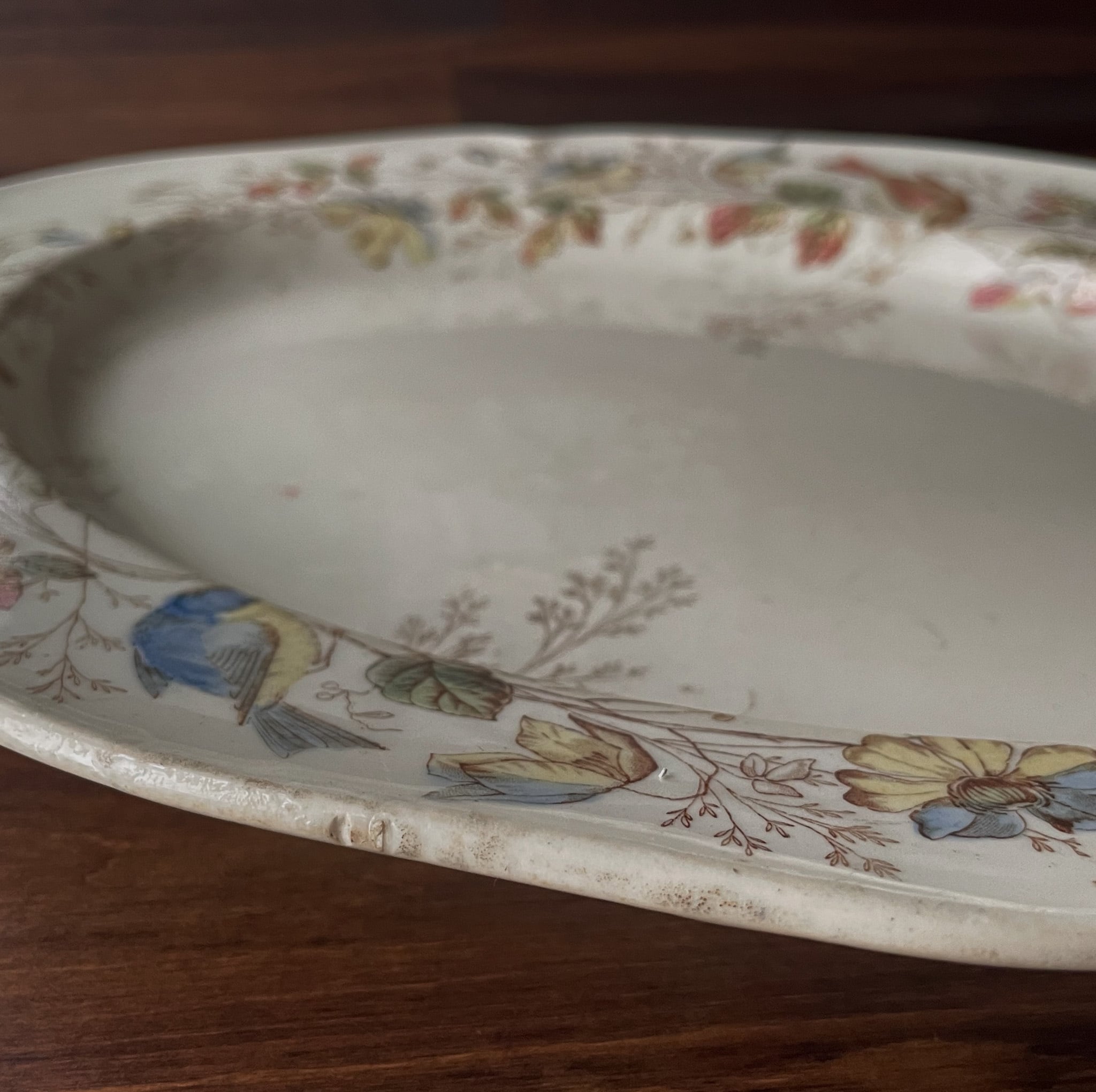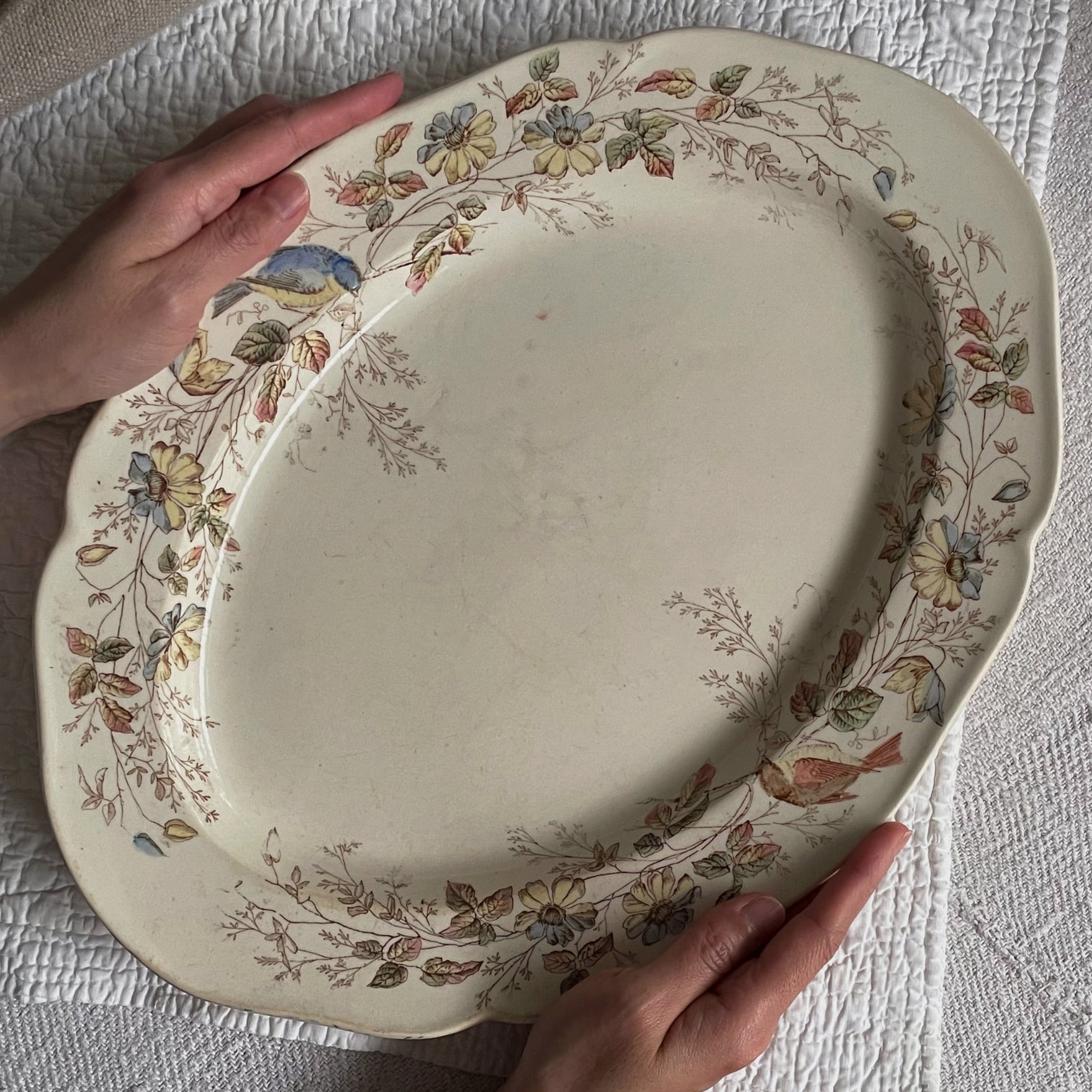 やわらかなクリーム色の陶肌に、花と小鳥が淡い色彩で描かれたオーヴァルの大皿。