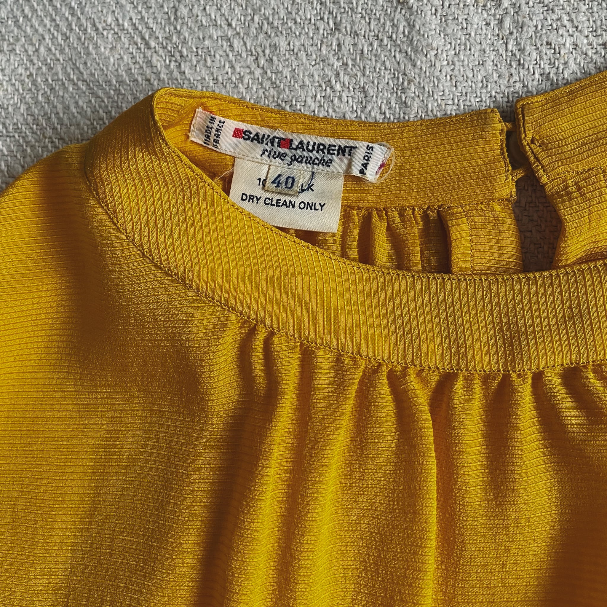 上質な織り生地には細かなストライプが美しく並び、色鮮やかに、そして深みのある黄色は、着る人だけでなく周りの人にも華やぎを添えてくれる素敵なシルクブラウスです。
