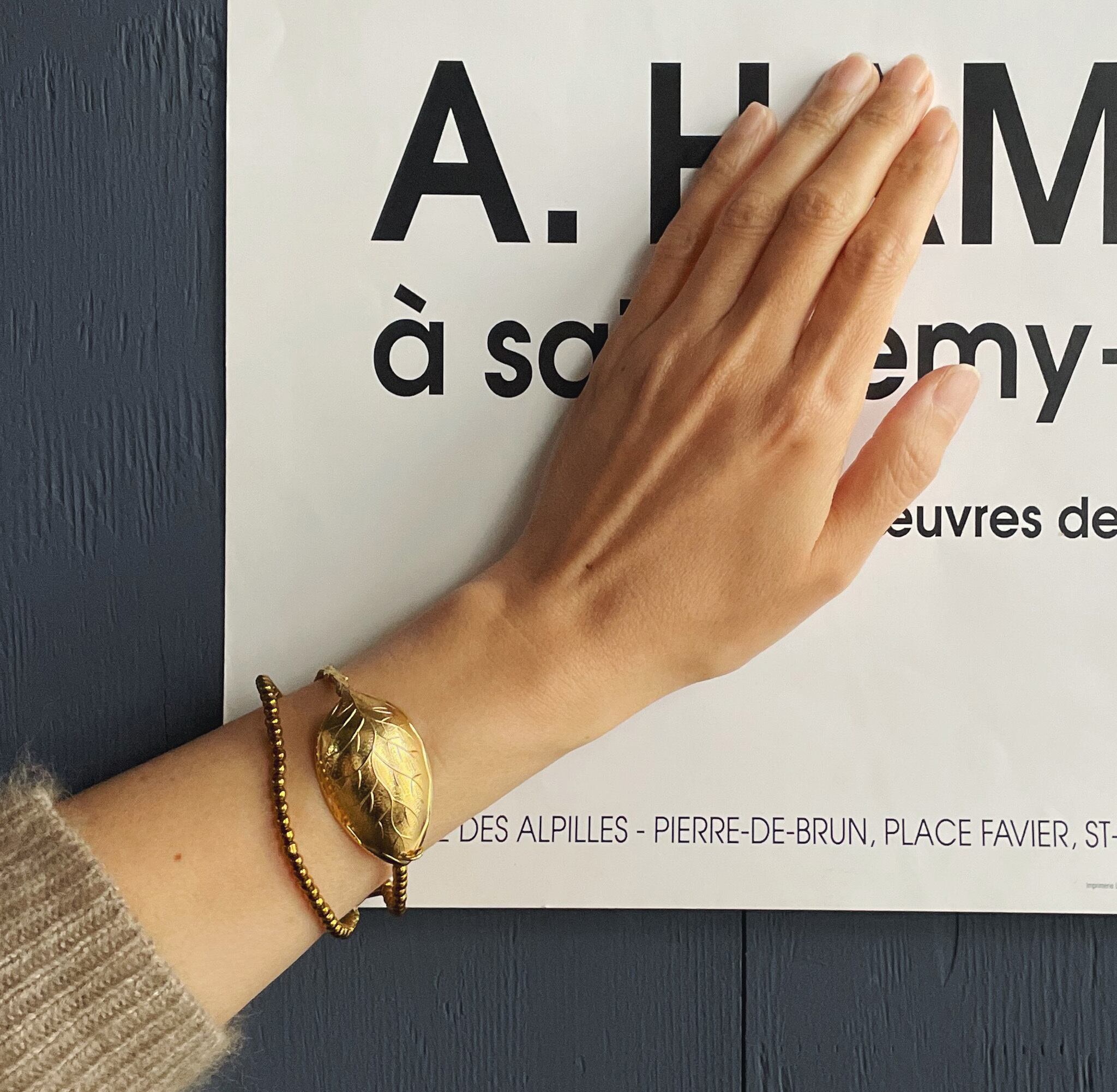 ゴールドプレートのリーフ型スプーンとゴールドコーティングしたヴィンテージビーズを組み合わせたブレスレット